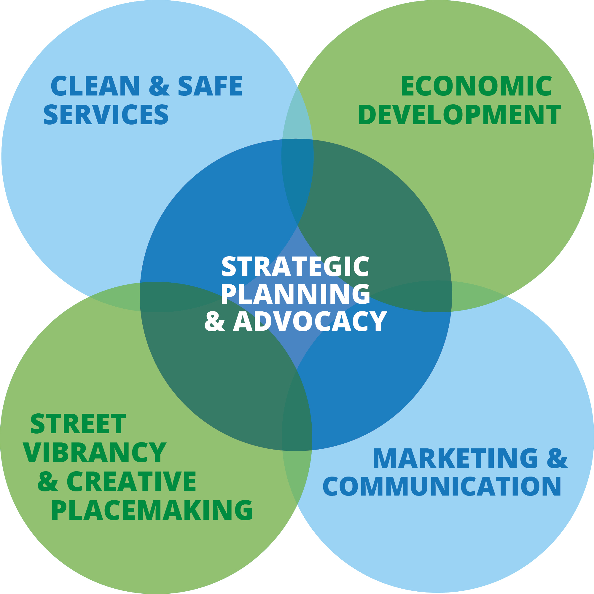 When members of the SID vote to renew it, they agree on a list of goals and strategies to implement over the course of the five-year term of the SID. The most recent plan outlines these areas of focus: strategic planning and advocacy, economic development, marketing & communication, street vibrancy & creative placemaking, and clean and safe services.