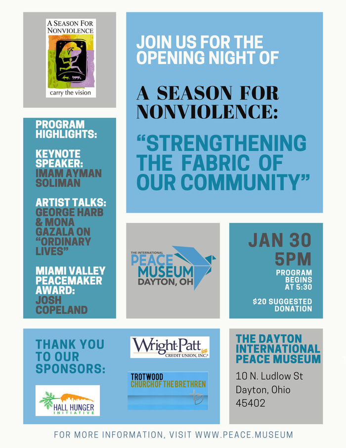 A Season for Nonviolence starts this Friday and runs through April 4, 2026. Our theme this year is “Strengthening the Fabric of Community (in order to eliminate ‘Other-ness’)”. The museum will be holding a series of events beginning on Friday, January 30th, at 5 pm. We will be joined by Imam Ayman Soliman as our keynote speaker. He was a Chaplain at Cincinnati Children’s Hospital, but his Visa was revoked, and then he was held in a detention facility for 73 days. Imam Soliman will share his story of hope and determination.