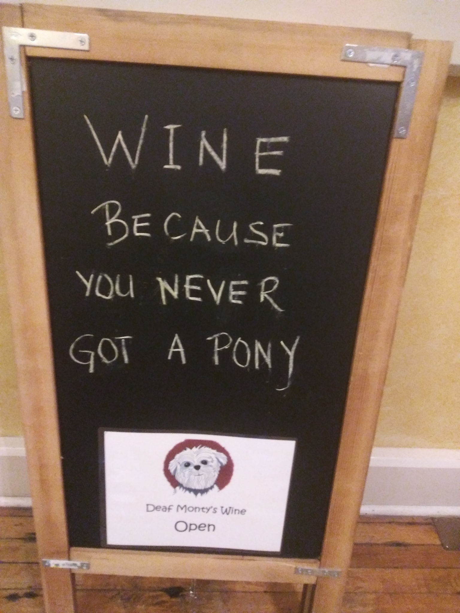 I’m Leslie Gonya from Deaf Monty’s Wine. My husband and I opened Deaf Monty’s 10 years ago. We always enjoyed wine bars when traveling and wanted to open a local option. Our neighbor was a distributor and thought it would be a great addition to our existing bed and breakfast, Inn Port Lodging. It’s a good location for neighbors and visitors. We became friends with the owners of Blind Bob’s, Lisa and Bob Mendenhall, when they used to stay at our bed and breakfast. At the time, we had a deaf pound puppy named Monty. We want to be an accessible wine bar so we used our dog in the logo. We thought since Blind Bob’s was in the neighborhood already, Deaf Monty was a good addition!