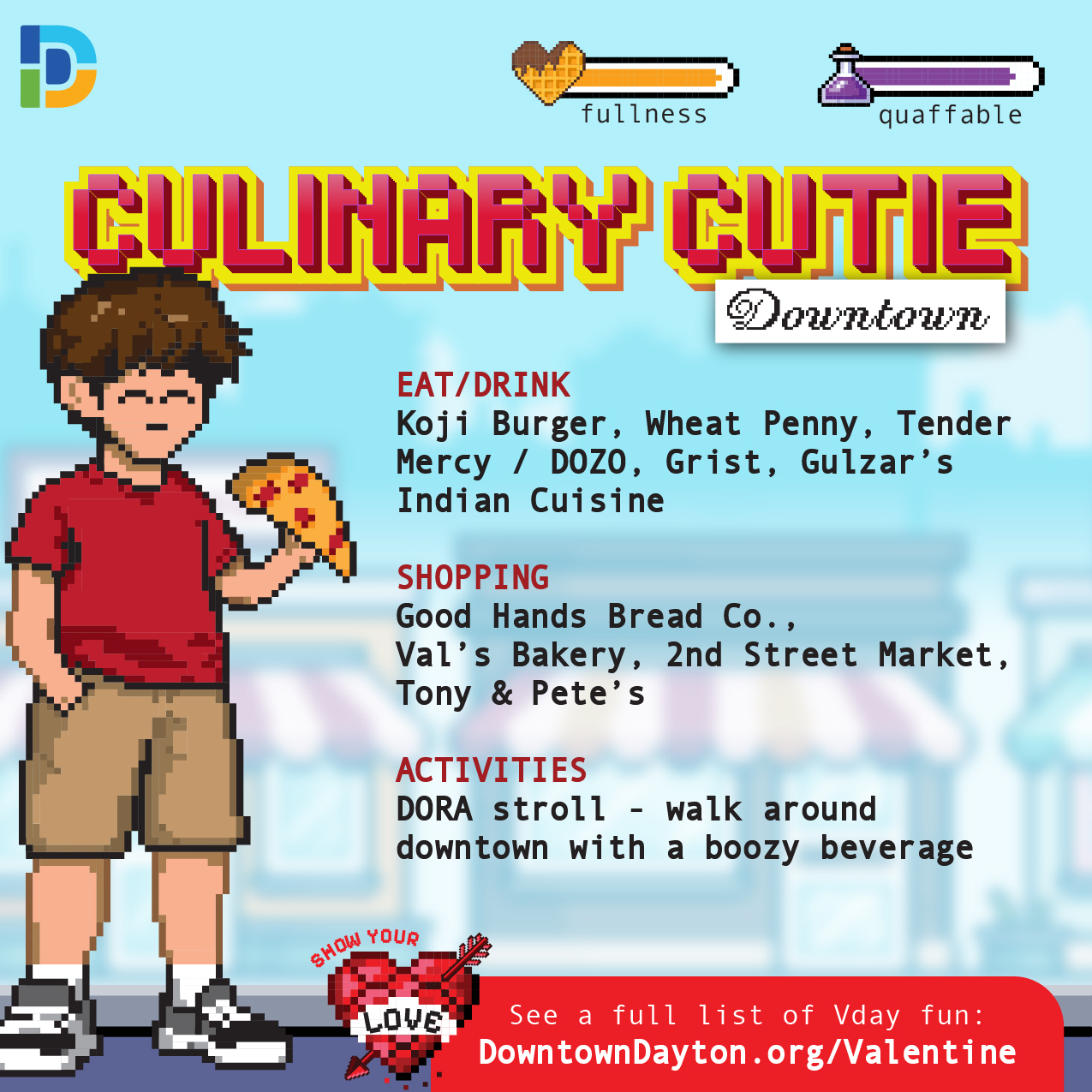 We've put together a list of some of the Valentine's Day highlights you'll find at Downtown Dayton's collection of independent, small businesses. From Culinary Cuties to Active Adventurers, there's something fun for every kind of character you'll find downtown!